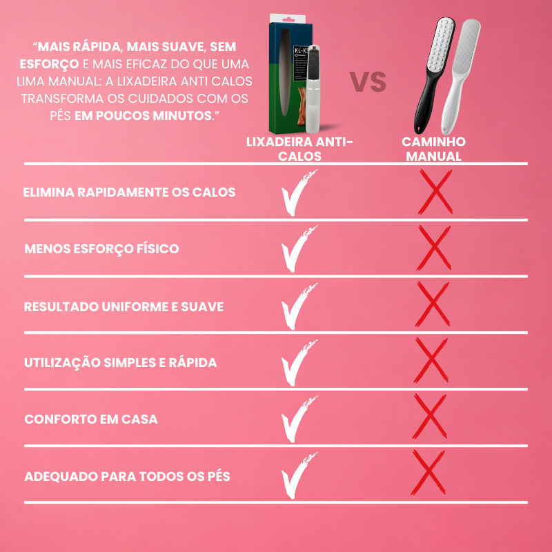 A nossa lima elétrica atua suavemente nas áreas ásperas dos pés para remover eficazmente calosidades e pele morta. Graças à sua cabeça giratória suave e precisa, ela lixa a superfície sem agredir ou danificar a pele, deixando os pés lisos, saudáveis e confortáveis desde a primeira utilização.